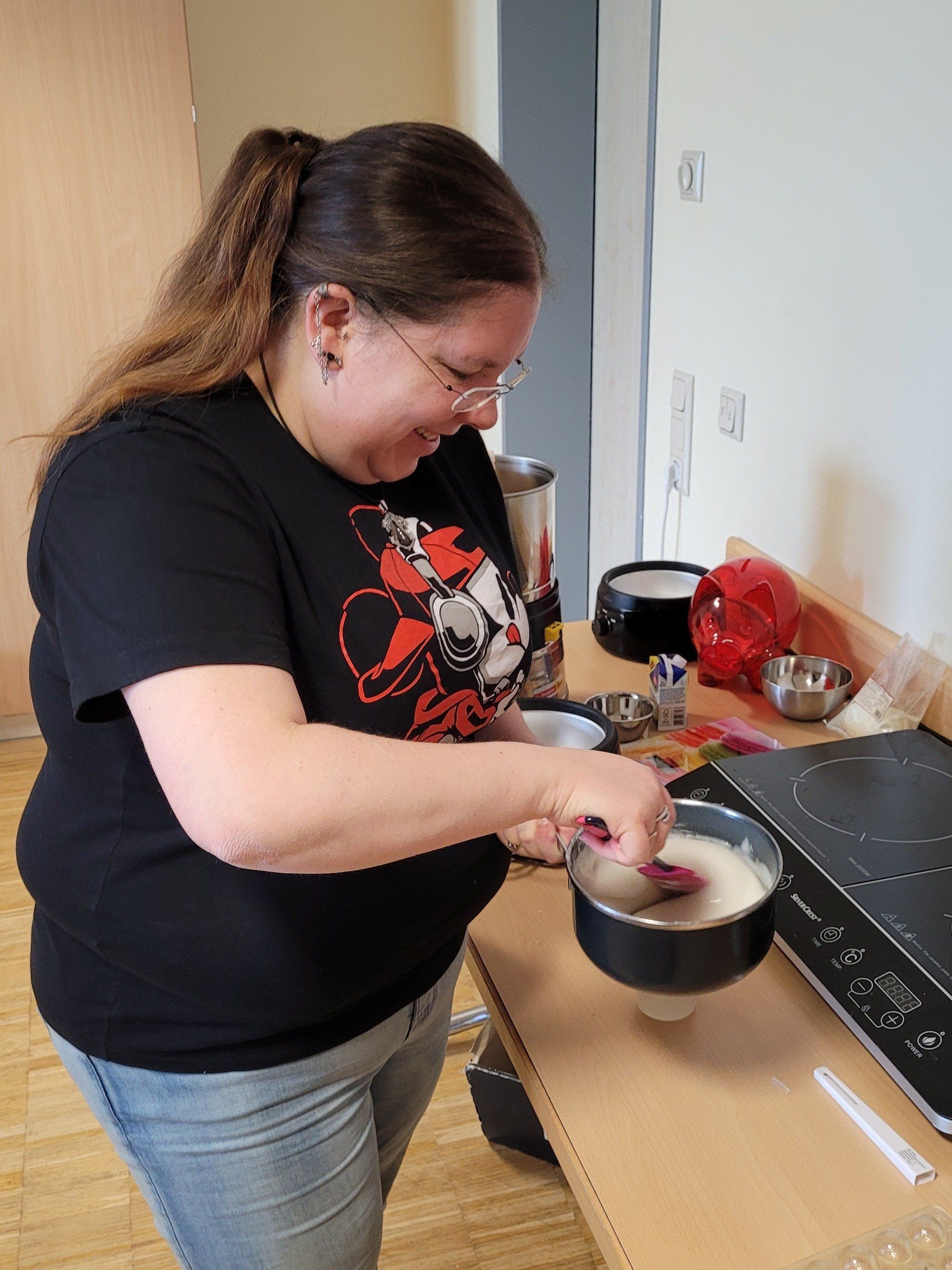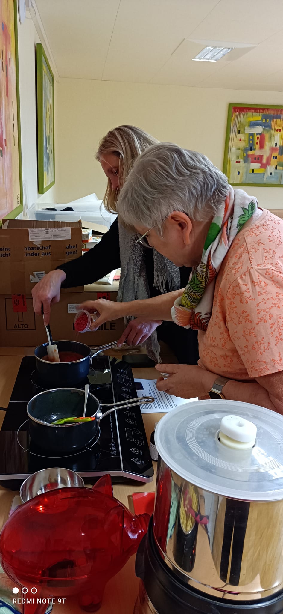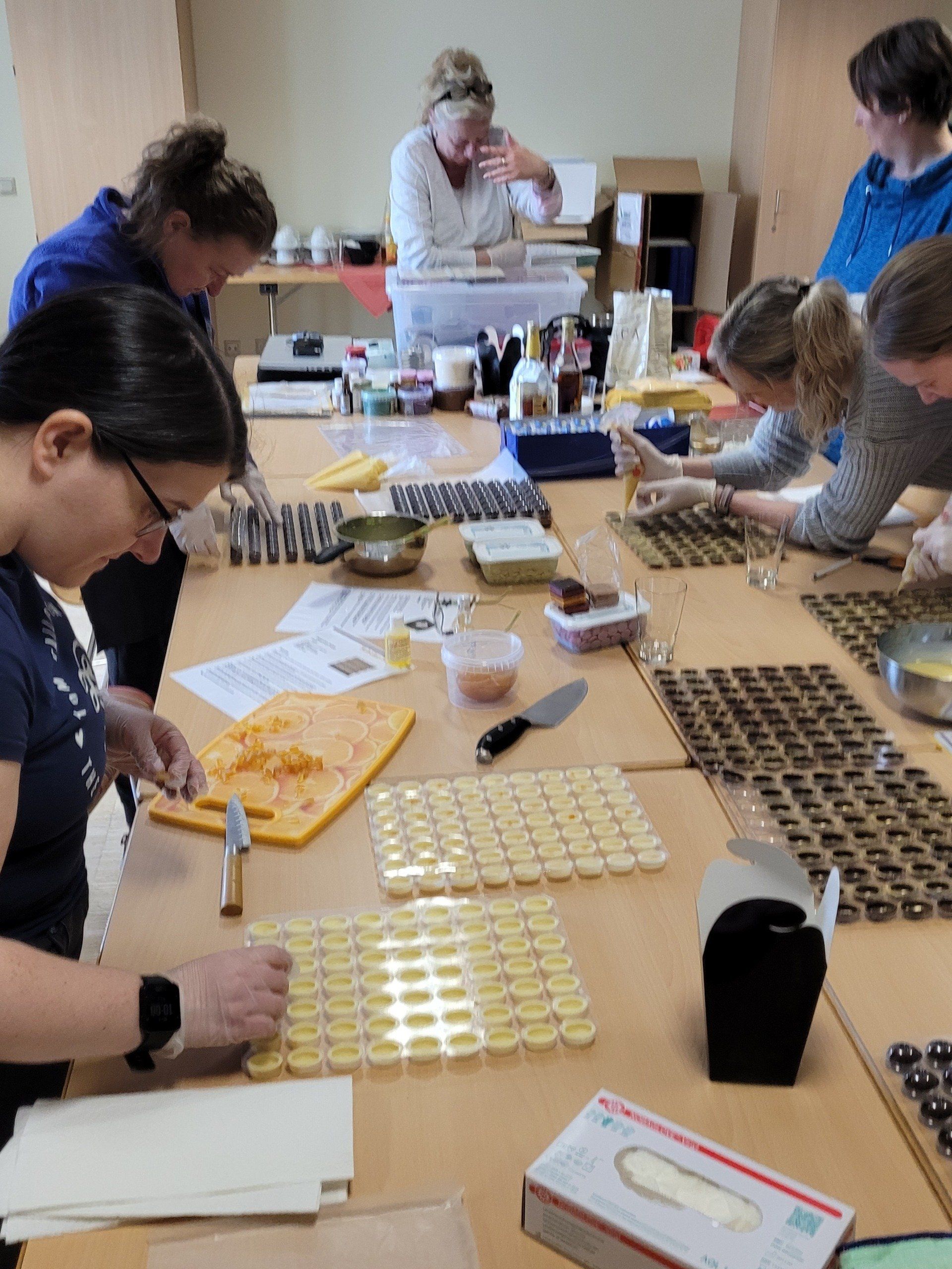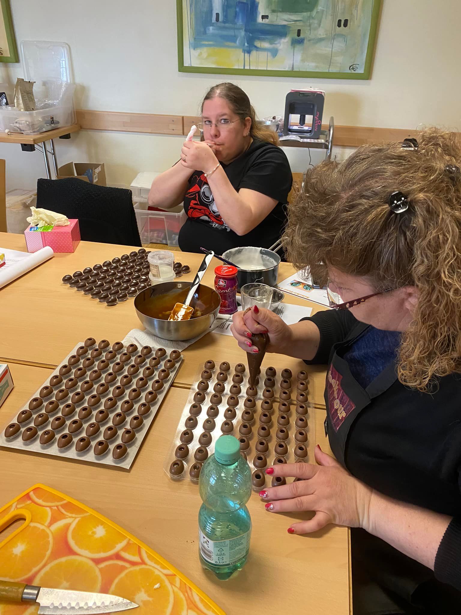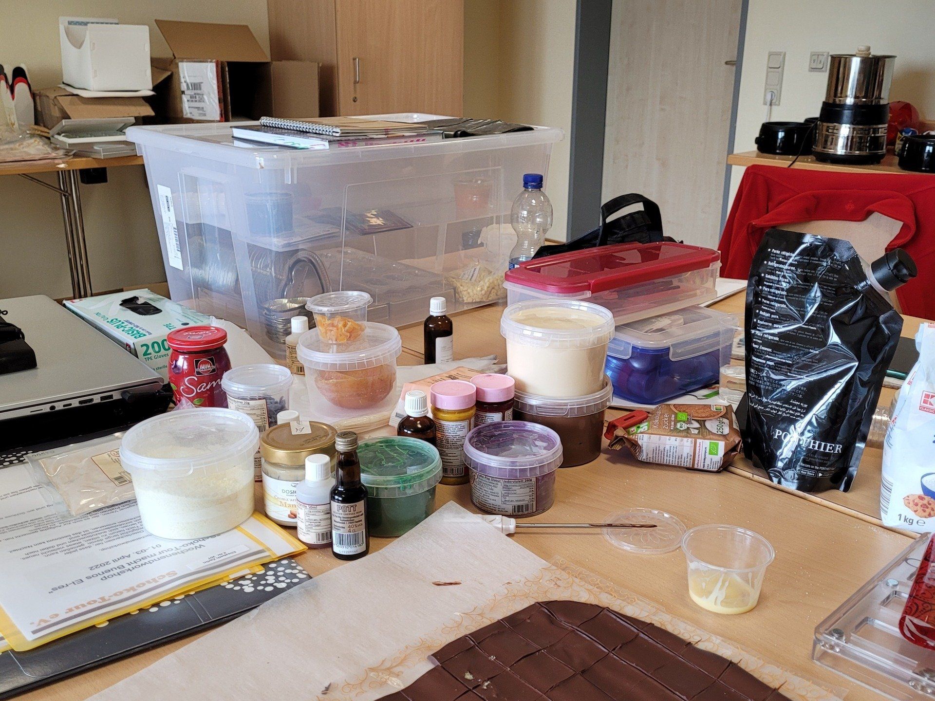 Diesmal waren wir eine etwas größere Gruppe von zwölf Personen und produzierten Ostereier und Fruchtgelee. Dazu gabs den Versuch von Kokoksschokolade... eben einen Versuch.