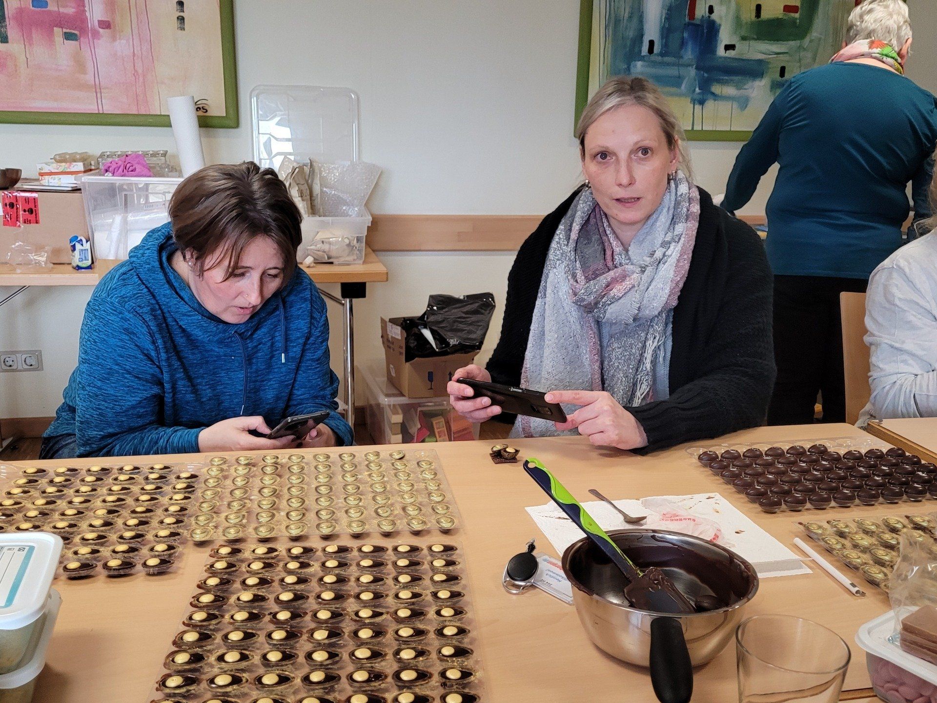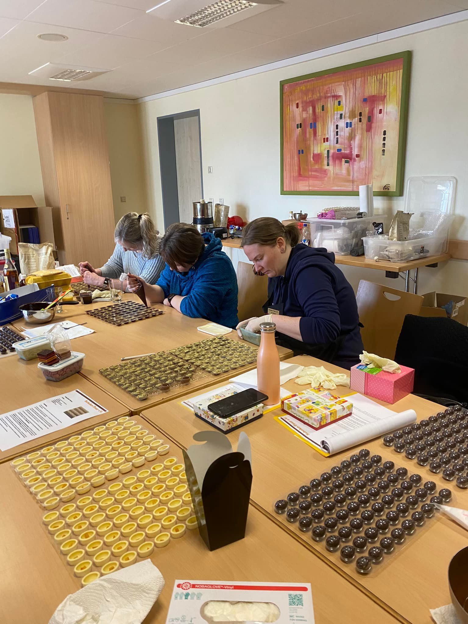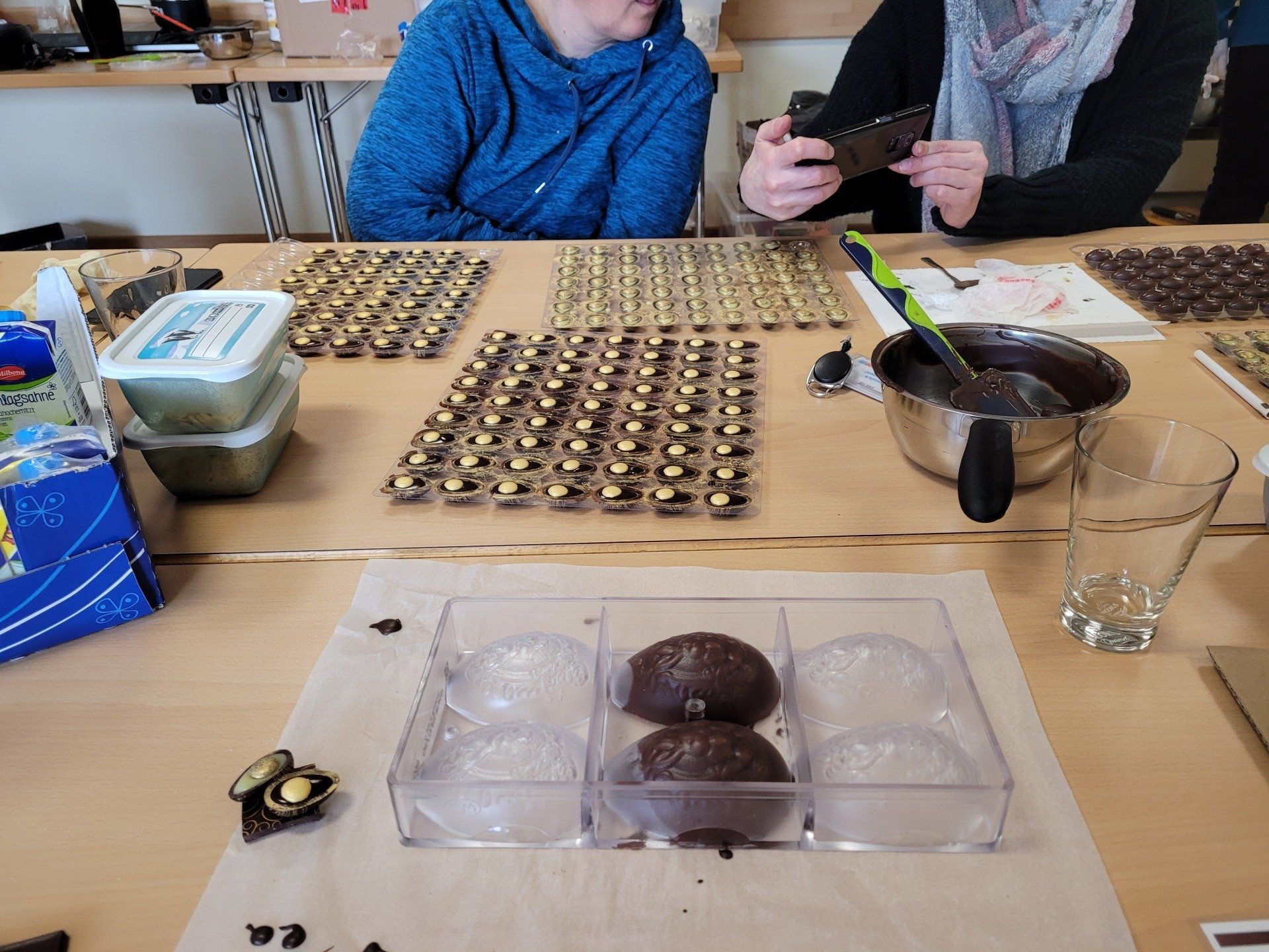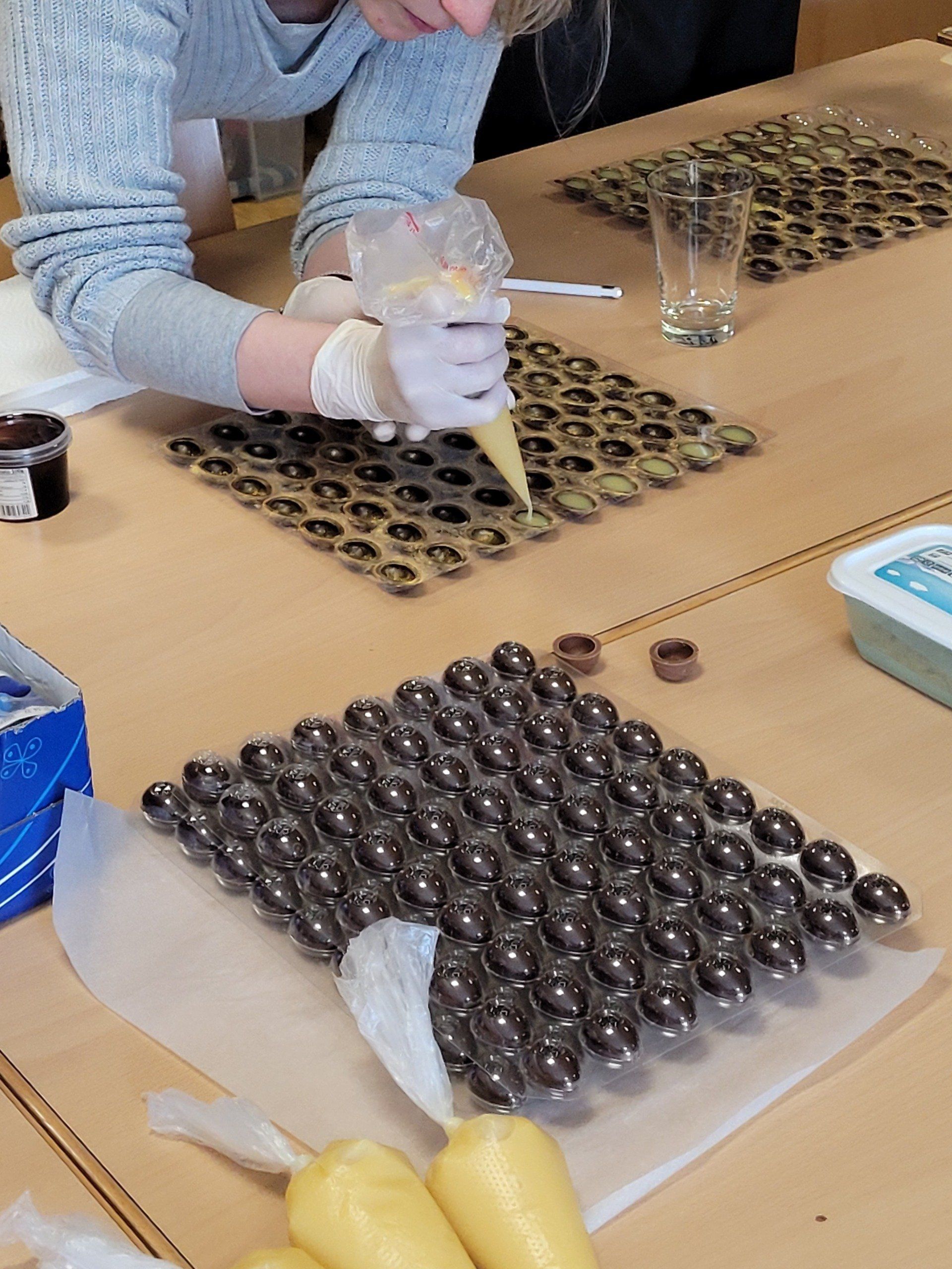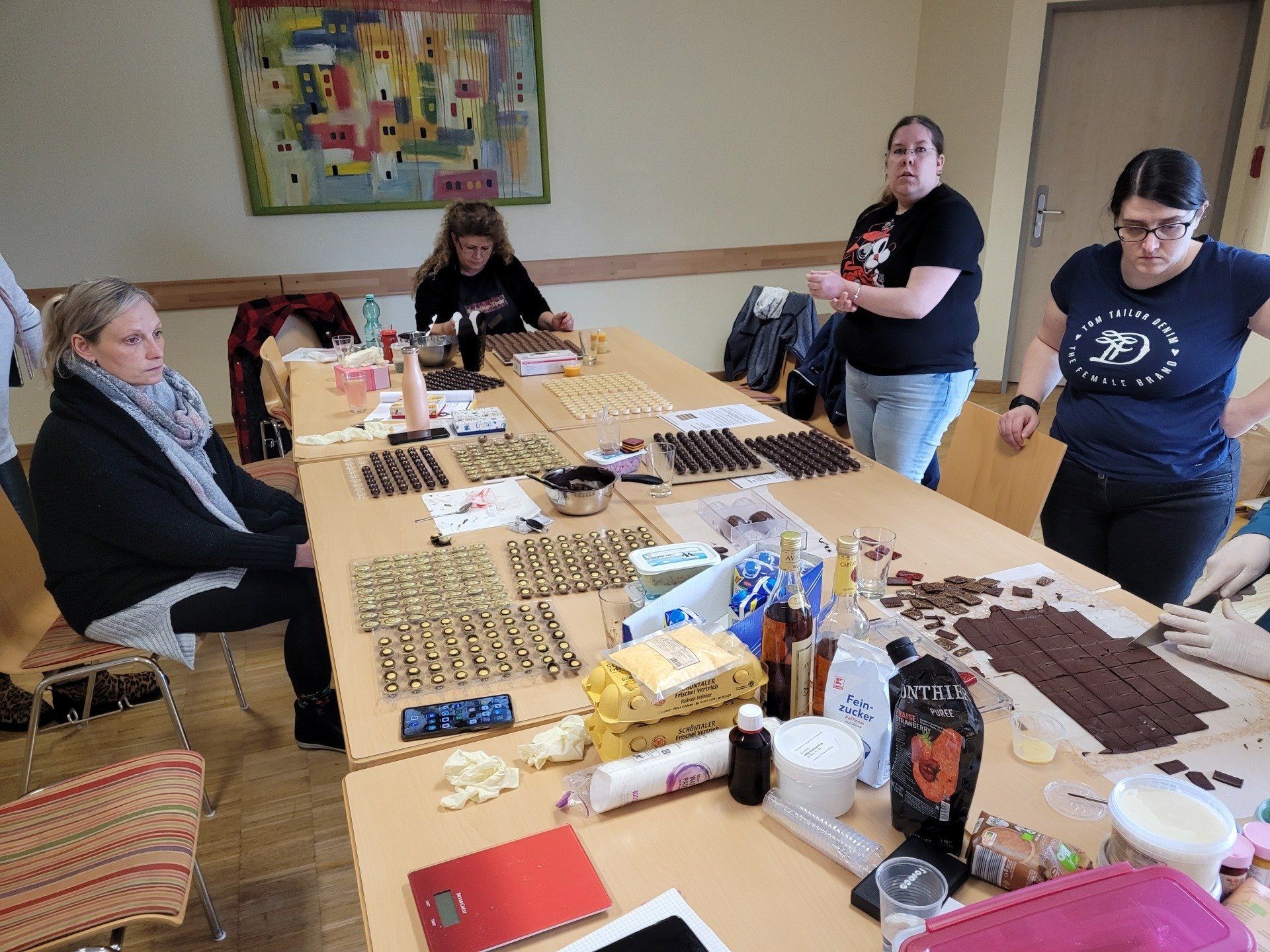 Diesmal waren wir eine etwas größere Gruppe von zwölf Personen und produzierten Ostereier und Fruchtgelee. Dazu gabs den Versuch von Kokoksschokolade... eben einen Versuch.