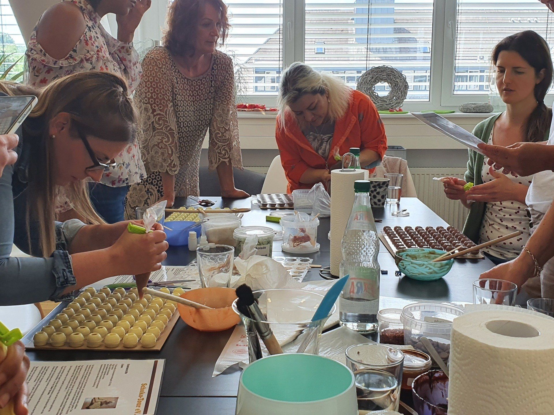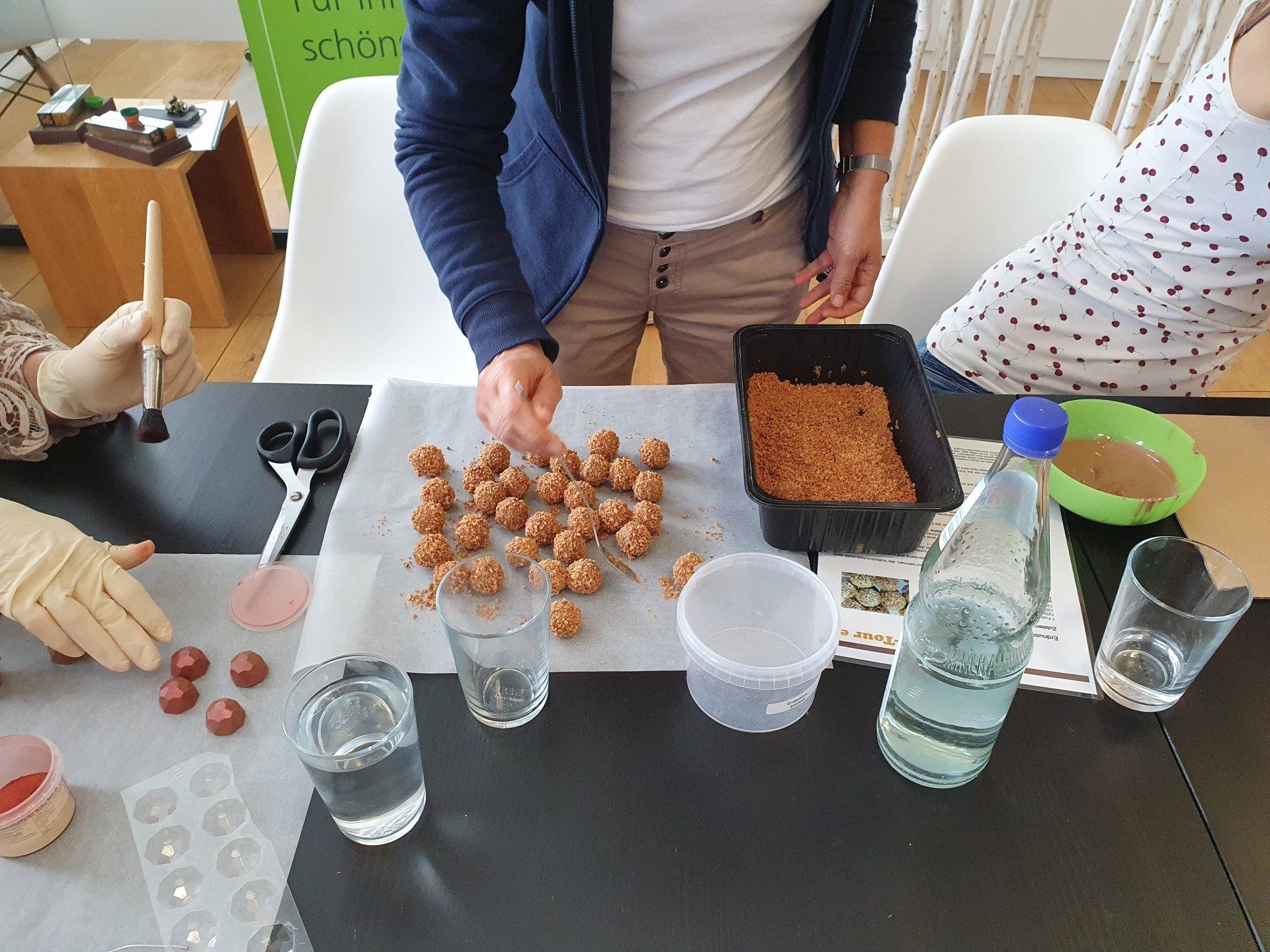 Ab 10.00 wurde eine kurze Einführung in Schokolade und Ganache gehalten, und die einzelnen Sorten erklärt. Die Damen haben beruflich bedingt ein Feingefühl für kleine Sachen und ruck-zuck wurden z.B. 63 Perlen auf 63 Pralinen angebracht. Auch sonst gingen die Arbeiten schnell und strukturiert von der Hand. Großes Lob dafür.