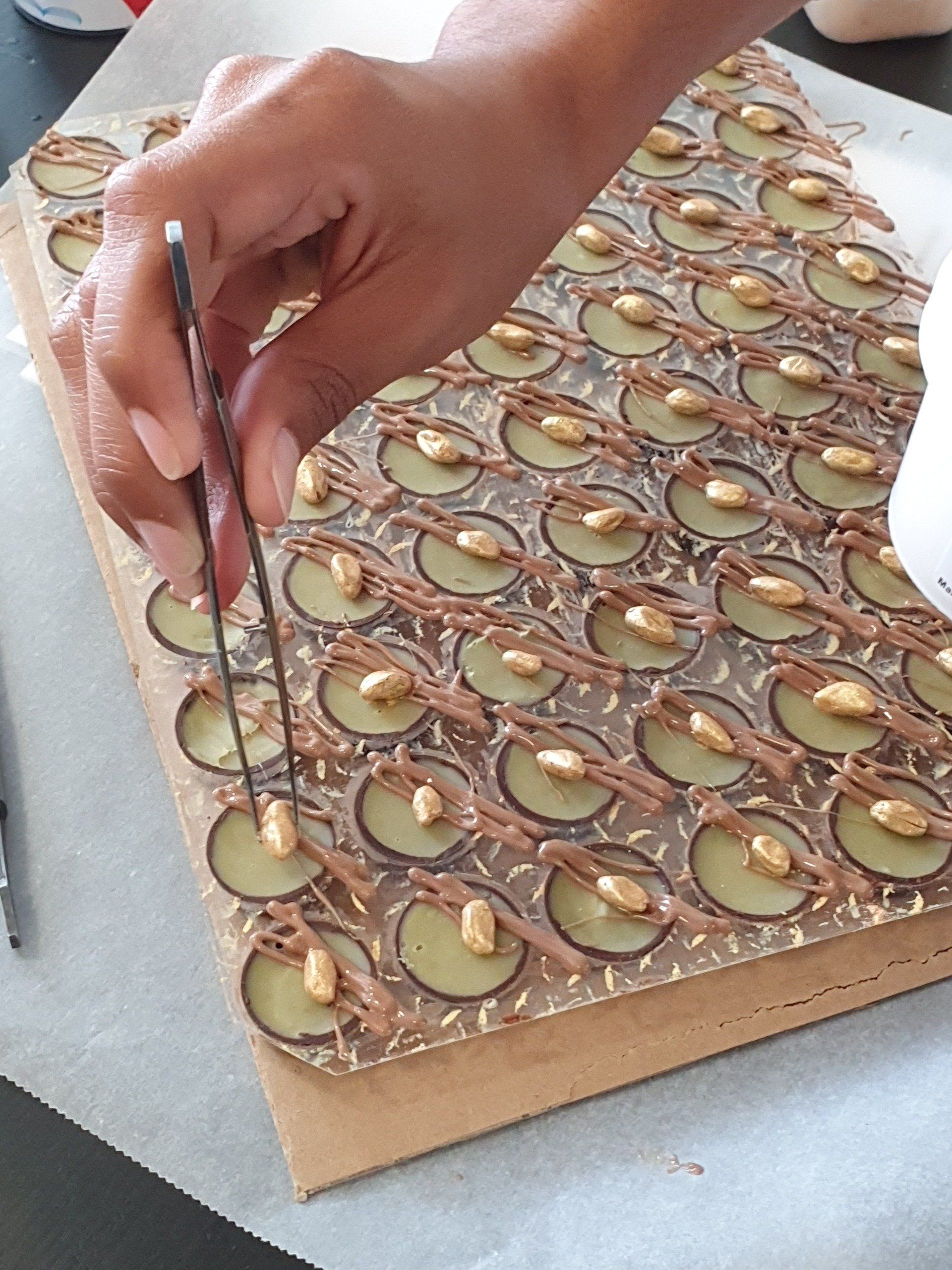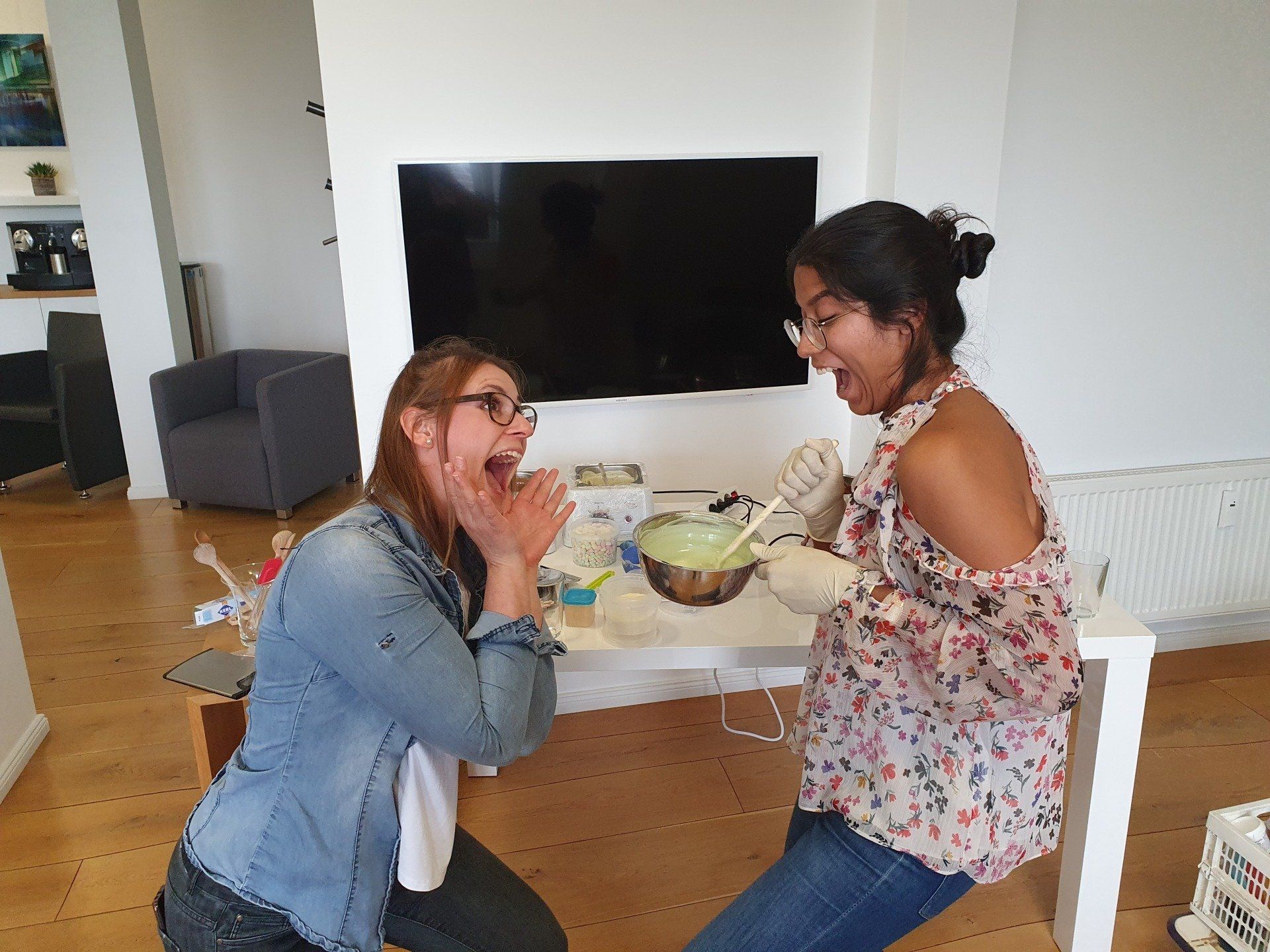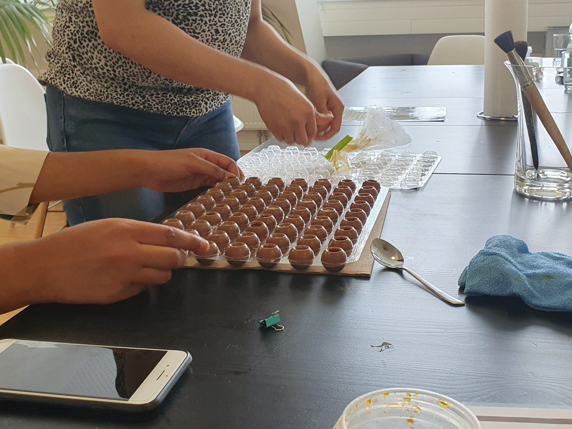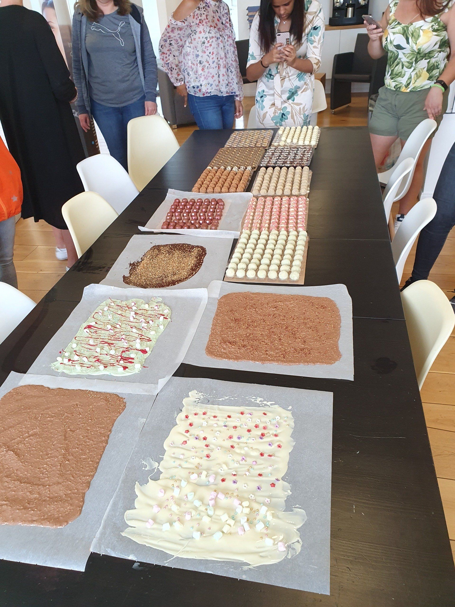 Es ist trotz den hohen Außentemperaturen gelungen. Die Praxis wurde auf 18°C runtergekühlt und so war es möglich mit Schokolade zu arbeiten.